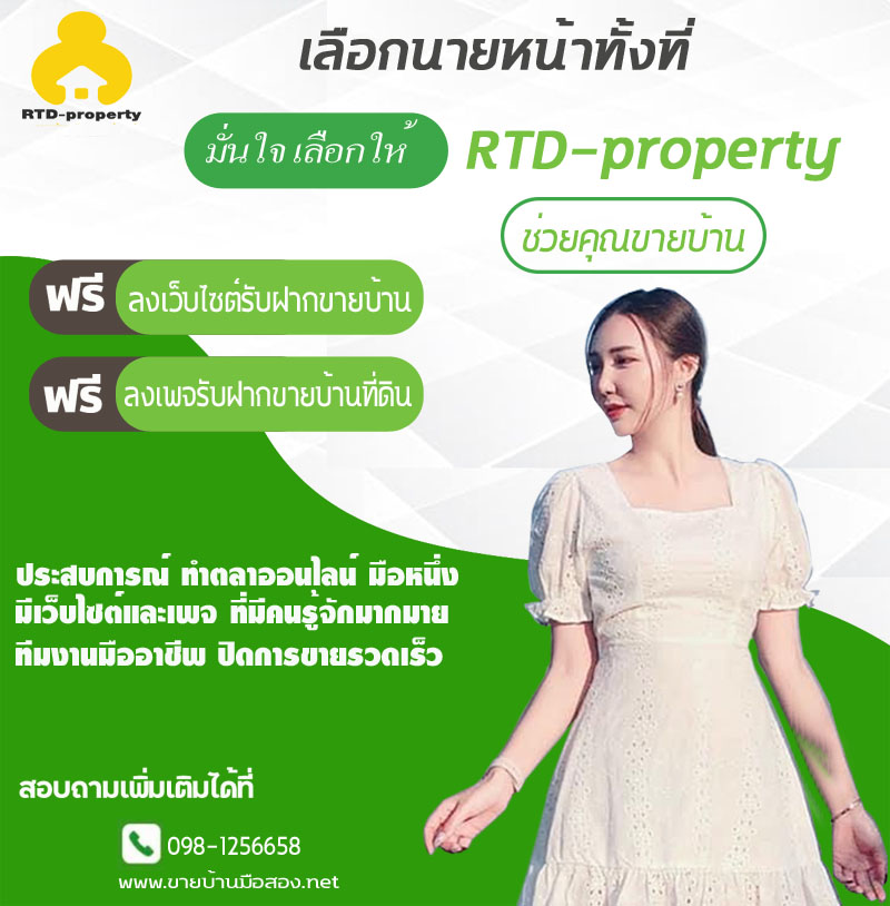 RTD-property บริการฝากขายบ้านที่ดินและอสังหาริมทรัพย์ทุกประเภท ฝากขายบ้านมือสองให้คำปรึกษาเรื่องการกู้ซื้อบ้าน ช่วยโฆษณาในทุกช่องทางให้ฟรี! จัดสินเชื่อให้ฟรี รับเดินเอกสารกู้แบงค์รับเดินเรื่องใช้น้ำและไฟฟ้า